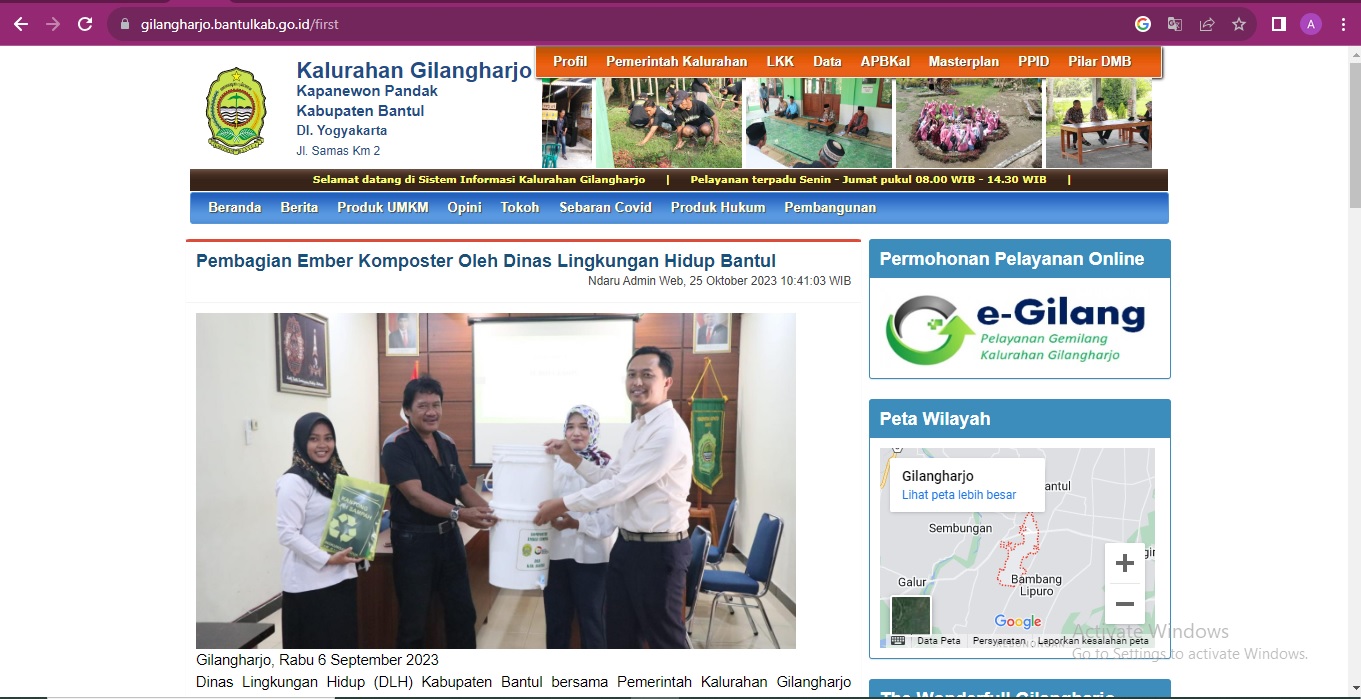 Gilangharjo yang berada di Yogyakarta sedangkan penulis di Jawa Timur harus menjalin hubungan riset dengan metode LDR. Hanya berbekal internet, penulis mencoba mengulik kesejahteraan dan kehebatan Gilangharjo. Betapa terpukaunya ketika melihat tampilan websitenya di alamat: https://gilangharjo.bantulkab.go.id/first. Tanpa henti aku bertanya dalam hati, benarkah ini website desa? Karena penulis pun asalnya dari sebuah desa jadi paham bagaimana kapasitas dan kelengkapan sebuah desa berkaitan dengan teknologi informasi.